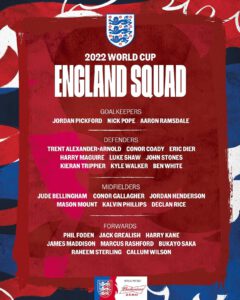 ประกาศออกมาเรียบร้อยแล้วสำหรับนักเตะที่ได้ไปฟุตบอลโลกที่กาต้าสำหรับทีมชาติอังกฤษ แต่มันก็มีตำแหน่งที่ขัดใจแฟนบอลหลายคนเช่นกองหลังอย่าง แฮรี่ แมกไกว ที่ไม่ได้ลงเล่นกับปีศาจแดงไม่มีผลงานเลยแต่กลับติดทีมชาติซ่ะงั้นเช่นเดียวกับกองกลางอย่าง คาวิน ฟิลลิป ที่ย้ายไปอยู่เรือใบสีฟ้าแมนเชสเตอร์ซิตี้แต่ก็ไม่ได้ลงสนามเลยเนื่องจากมีอาการบาดเจ็บแต่ก็กลับมีชื่อติดทีมชาติเช่นเดียวกัน